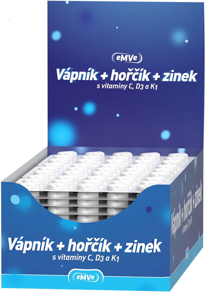 eMVe Vápník-hořčík-zinek s vitaminy C, D3 a K1 obsahuje aktivní látky, které přispívají k udržení normálního stavu kostí a zubů v období dospívání, při rekonvalescenci po úrazech se zlomeninami, osobám ohroženým řídnutím kostní hmoty a současně i lidem s vyšší fyzickou zátěží.