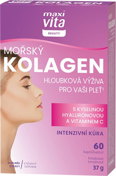 Maxi Vita Beauty Mořský kolagen obsahuje vysokou dávku bioaktivního mořského kolagenu COLLAGEN HM, který je výjimečný pro svoji vysokou biologickou vstřebatelnost. Dodává tělu potřebné peptidy a aminokyseliny důležité pro tvorbu kolagenu.