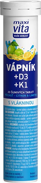 Nové šumivé vitamíny s vlákninou a přírodní ovocnou složkou. Udržujte vaše kosti a zuby v kondici pravidelným příjmem vápníku, vitaminů D3 a K1 ve formě šumivých tablet s vynikající příchutí citronu a limetky. Bez cukru.