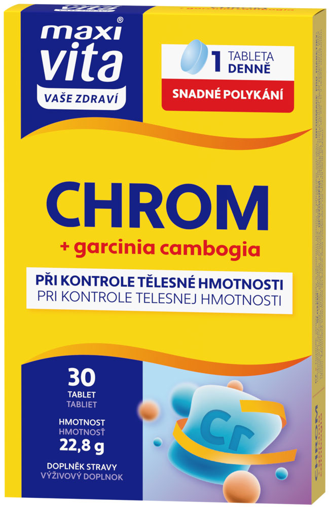 Maxi Vita Chrom + garcinia cambogia obsahuje významný stopový prvek chrom a přírodní extrakt z rostliny Garcinia cambogia.