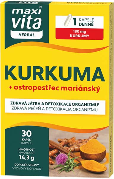 Maxi Vita Herbal Kurkuma obsahuje vysokou dávku extraktu z kořene kurkumy a extraktu ze semen ostropestřce mariánského. Obě tyto rostliny jsou prospěšné pro zdraví jater a tím i pro celkové zažívání.