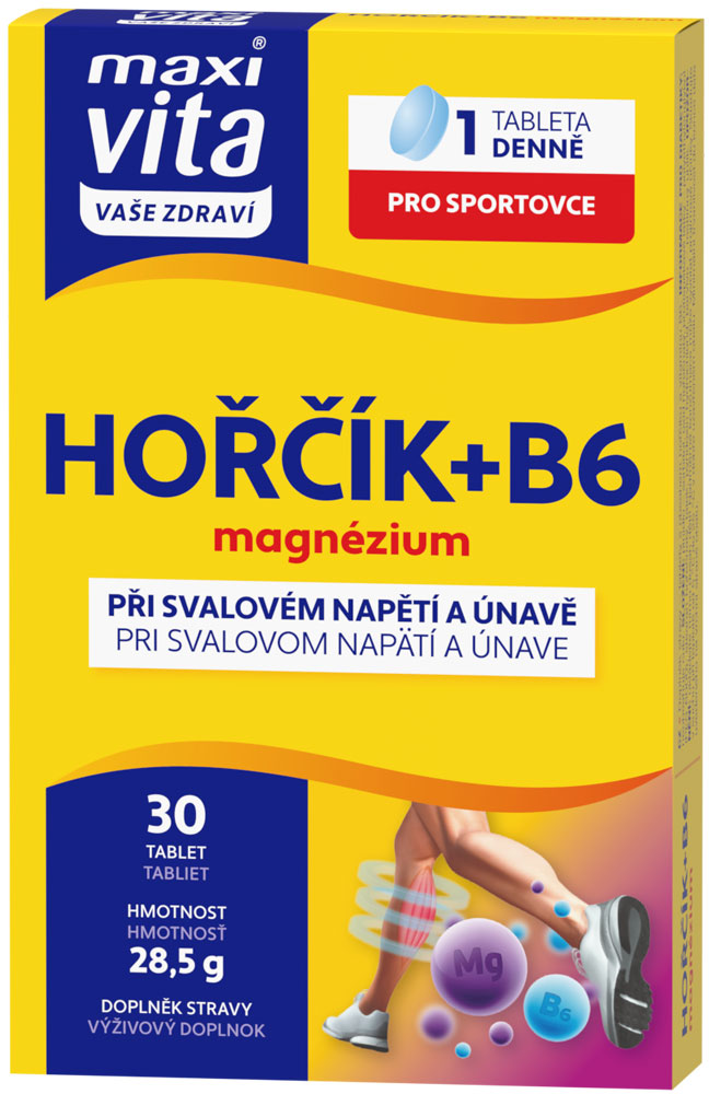 Maxi Vita Hořčík + B6 obsahuje aktivní látky, které přispívají ke snížení míry únavy a vyčerpání, normální činnosti svalů a nervové soustavy a k celkovému posílení imunitního systému.