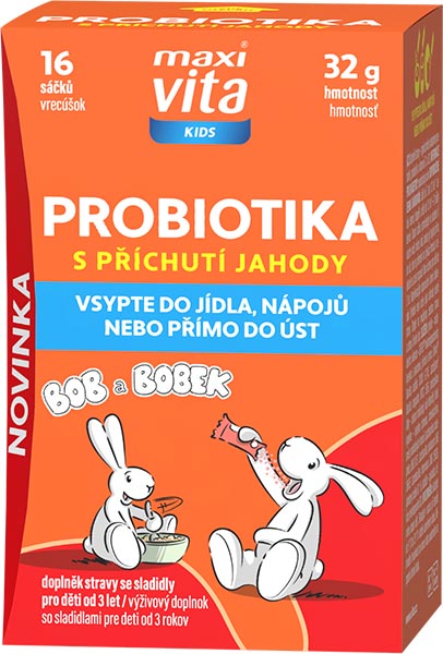 Maxi Vita Kids Probiotika nabízí více možností užívání – směs je možné vsypat do jídla, nápojů nebo přímo do úst, kde se přemění na žvýkací hmotu a následně se zcela rozpustí. Děti si probiotika s jahodovou příchutí zamilují.