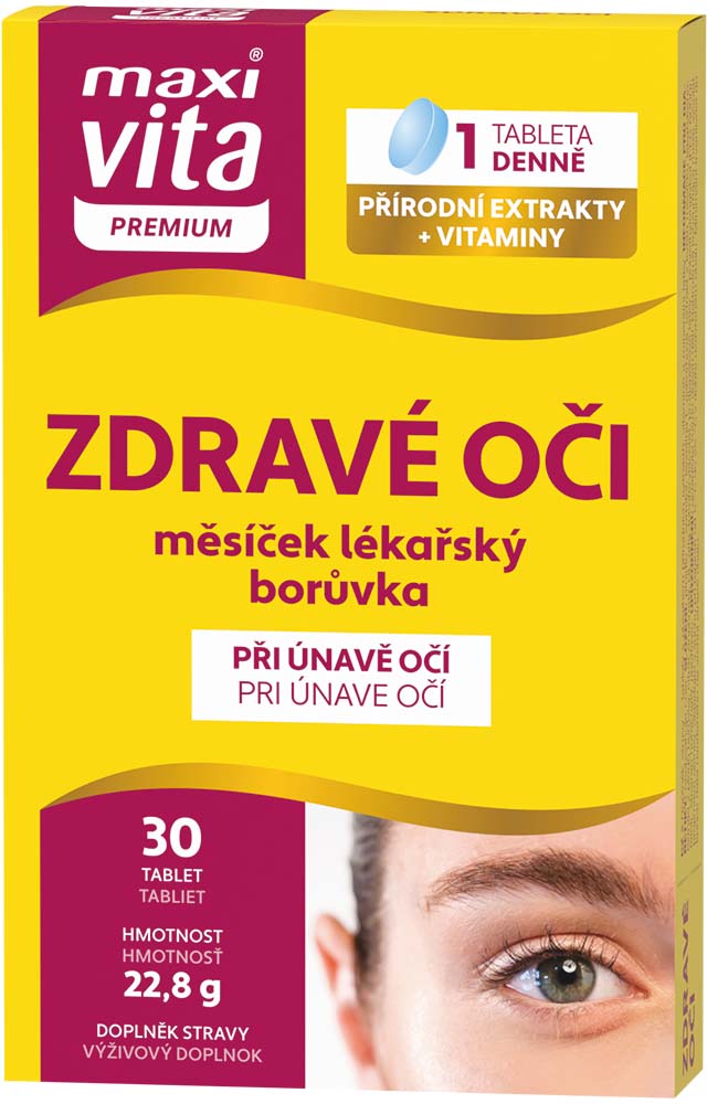 Přípravek Maxi Vita Zdravé oči obsahuje přírodní extrakty z borůvky a měsíčku lékařského, který je zdrojem karotenoidů luteinu a zeaxantinu.
