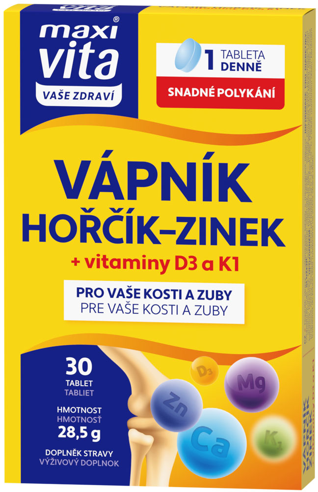 Přípravek Maxi Vita Vápník-hořčík-zinek s vitaminem D3 a vitaminem K1 obsahuje aktivní látky, které přispívají k udržení normálního stavu kostí a zubů v období dospívání, při rekonvalescenci po úrazech se zlomeninami, osobám ohroženým řídnutím kostní hmoty a současně i lidem s vyšší fyzickou zátěží.