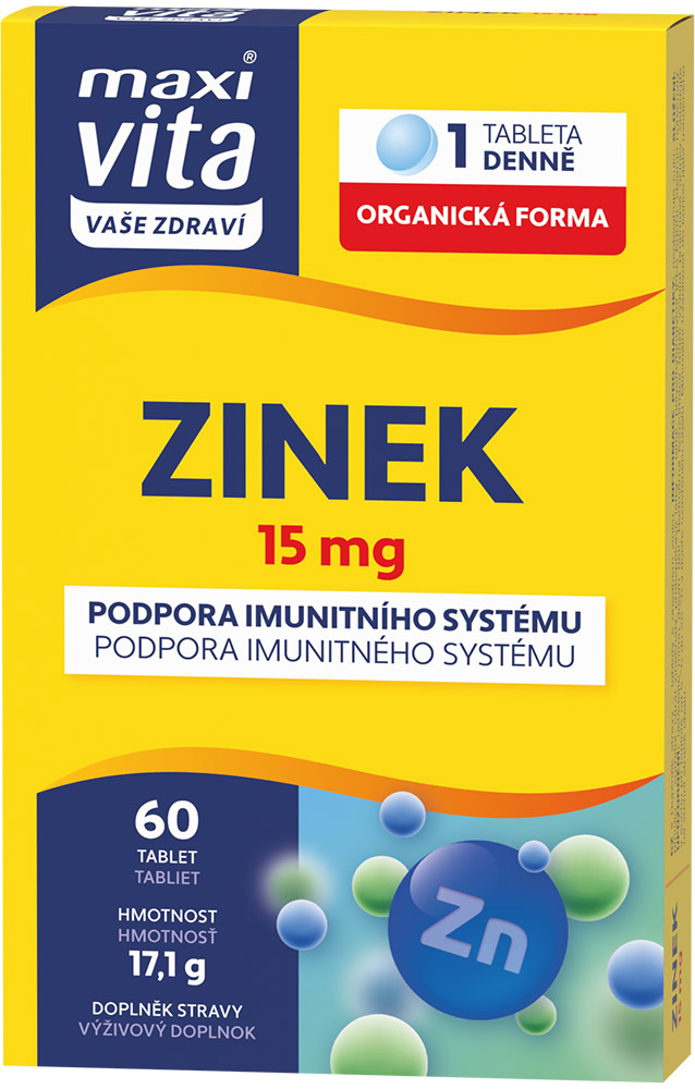 Maxi Vita Zinek 15 mg obsahuje organicky vázaný zinek, který je pro lidský organizmus lépe vstřebatelný. Zinek Je nepostradatelným stopovým prvkem, který se nachází v každé buňce. Jeho přítomnost v lidském organizmu je důležitá pro zajištění normální funkce metabolizmu.