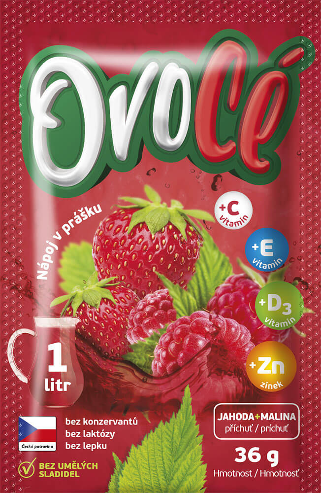 OvoCé – rozpustný osvěžující vitaminový nápoj s příchutí jahody a maliny. S cukrem.