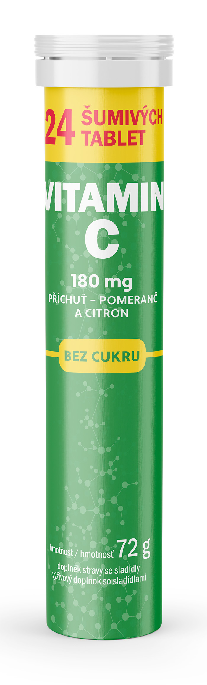 Šumivé tablety s obsahem vitaminu C, s příchutí pomeranče a citronu.