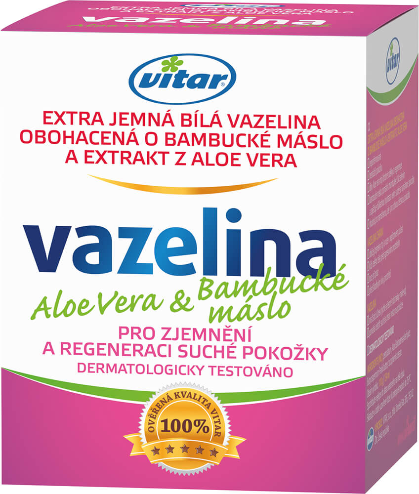 Extra jemná bílá vazelina obohacená o bambucké máslo a extrakt z Aloe vera: - neparfemovaná - nedráždí pokožku a působí protizánětlivě - Aloe vera hojí drobné oděrky a regeneruje - bambucké máslo pomáhá chránit před UV zářením a zajišťuje důkladnou hydrataci velmi suché a namáhané pokožky - vhodná i pro citlivou dětskou pokožku
